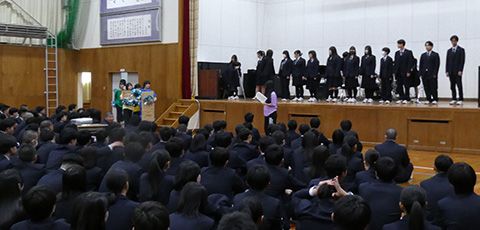 4/9に新入生と在校生の対面式とようこそ先輩がありました。対面式は、歓迎パフォーマンスや生徒会長・新入生代表の挨拶が行われました。ようこそ先輩は、日本を代表するスキージャンプ選手として活躍されている勢藤優花氏をお招きし、世界最高峰の舞台である「オリンピック」への挑戦などを語って頂きました。ありがとうございました。写真は、対面式(上)・ようこそ先輩(下)の様子です。