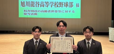 2/1に旭川市の社会福祉大会がありました。その中で、ボランティア・地域活動功労者に対する表彰が行われました。野球部の「校舎周辺の高齢者地帯等に対する除雪活動」に対して、社会福祉協議会会長彰を受けました。本校では、地域に開かれた学校づくりを推進しており、生徒の社会貢献活動を積極的に支援しています。 野球の技術向上だけでなく、地域社会の一員としての成長を目指し、今後も活動を継続してまいります。