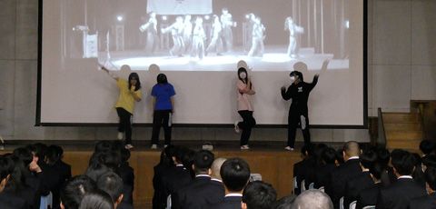 4月9日、対面式と「ようこそ先輩」に続き、新入生への部活動紹介が行われました。本校には体育系13、文化系9の部活動があり、それぞれ活発に活動しています。紹介では各部の代表生徒が、日頃の活動内容の解説やパフォーマンスを交え、熱心に勧誘を行っていました。写真は、ダンス部の様子です。